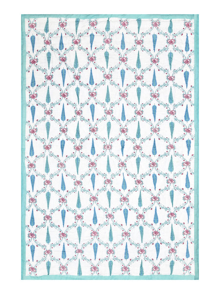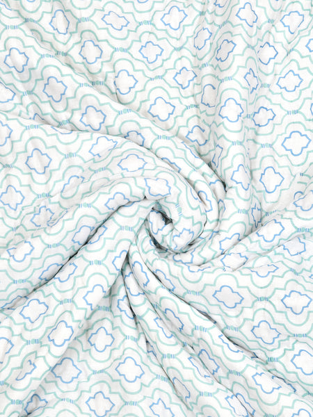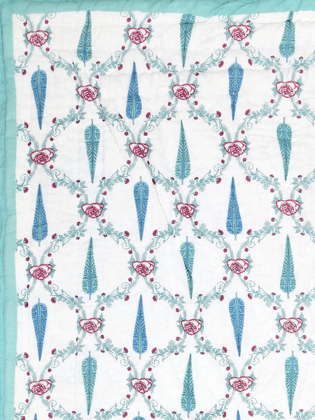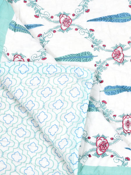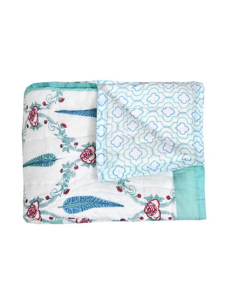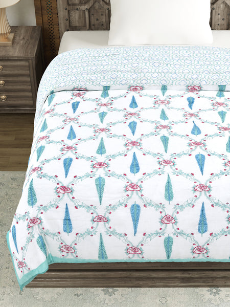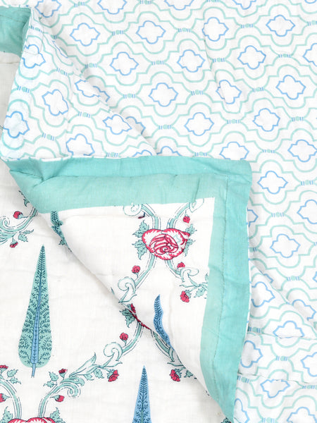 Cotton Single Size Quilt/ Rajai Hand Block Print for Light Winters (150x225 cm) (Turq Patti)