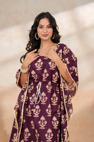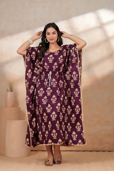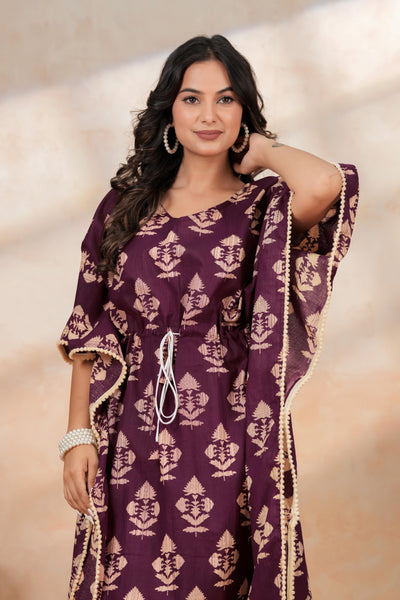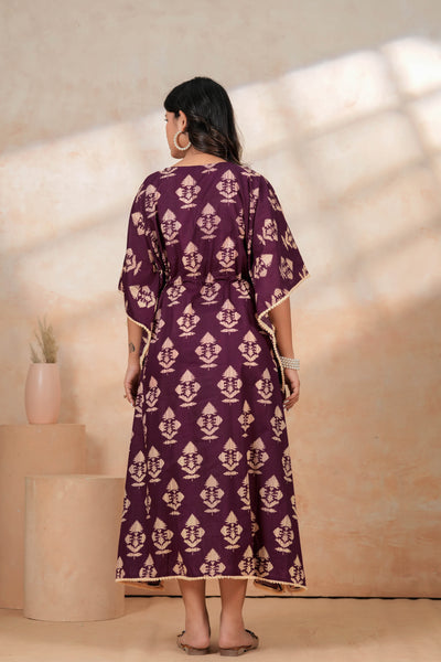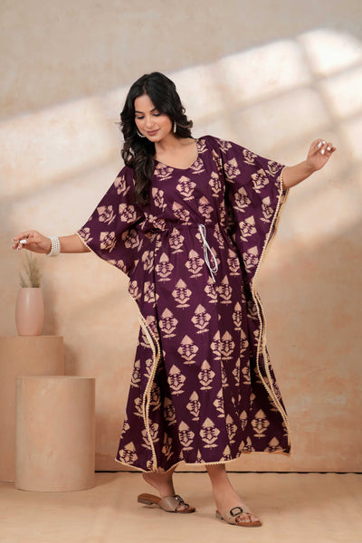 Hand Block Kaftan in Pure Cotton Fabric Maroon Cream